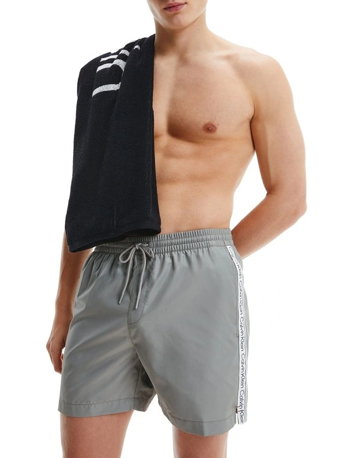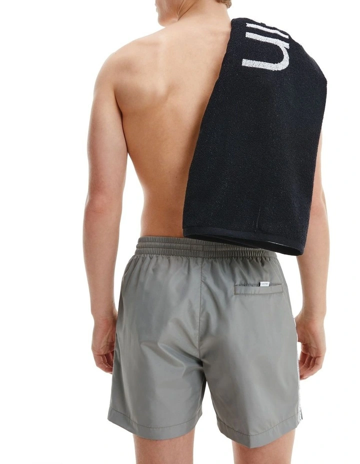 Medium length swim shorts crafted from recycled materials. These shorts feature an elastic drawstring waist, multiple pockets and CK branded trim on the sides.