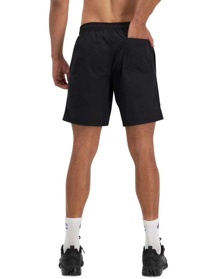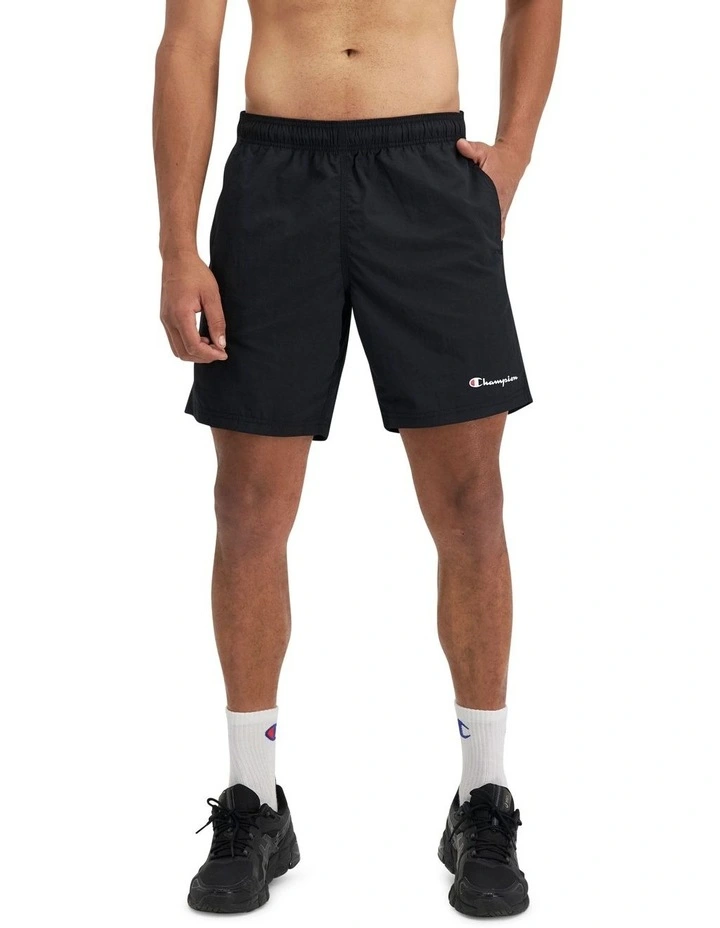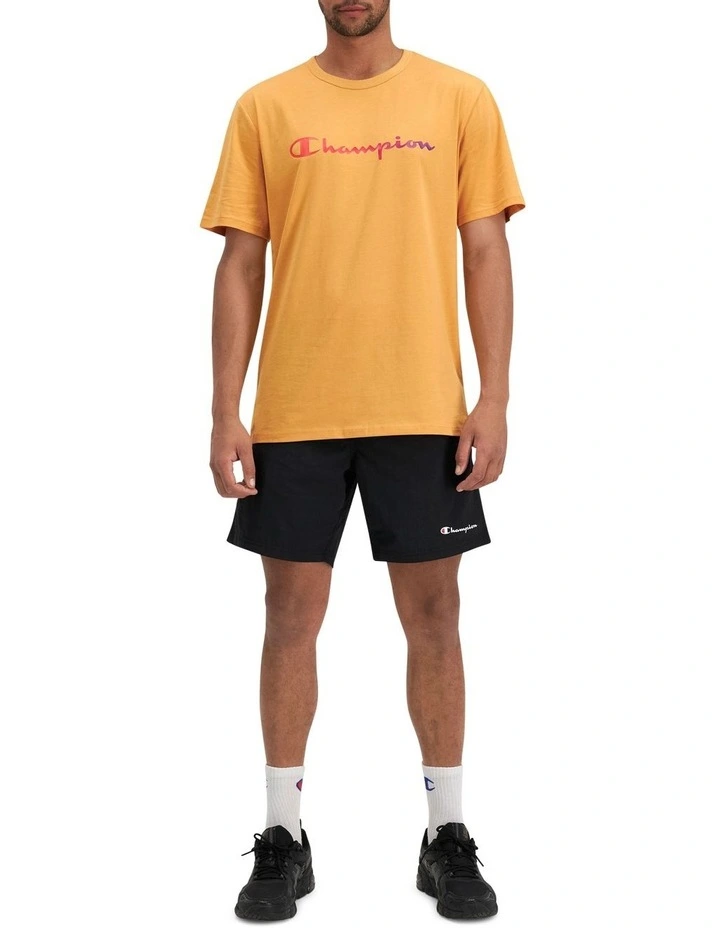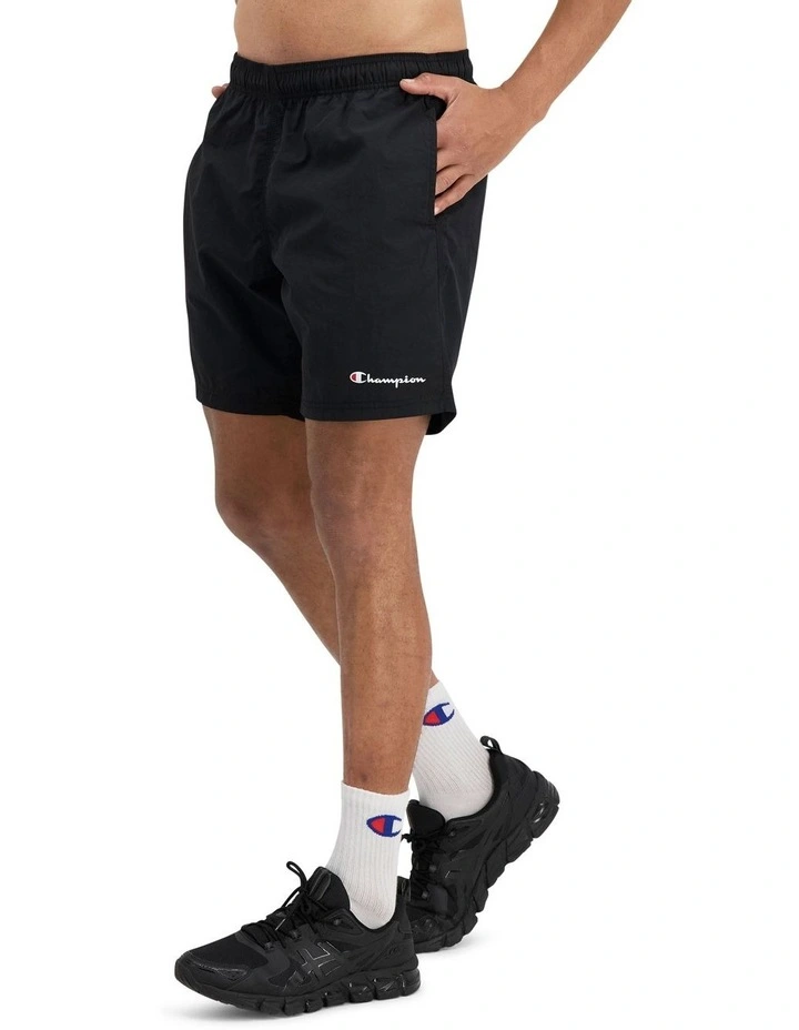 Champion script print on left leg hem.