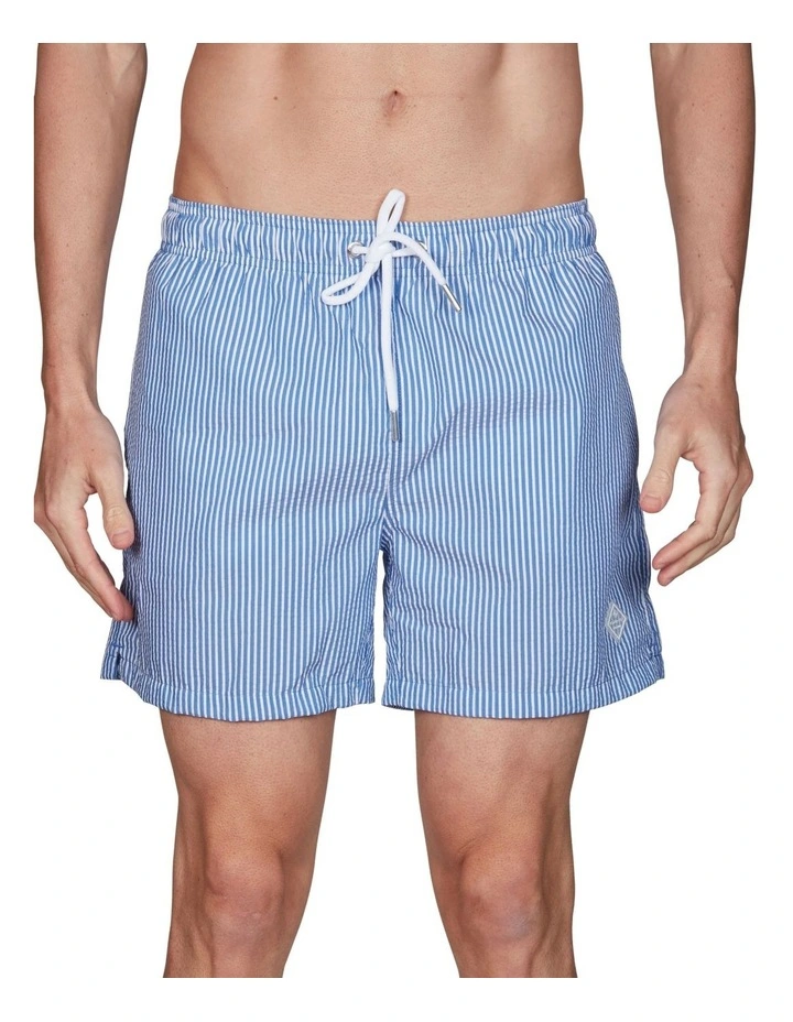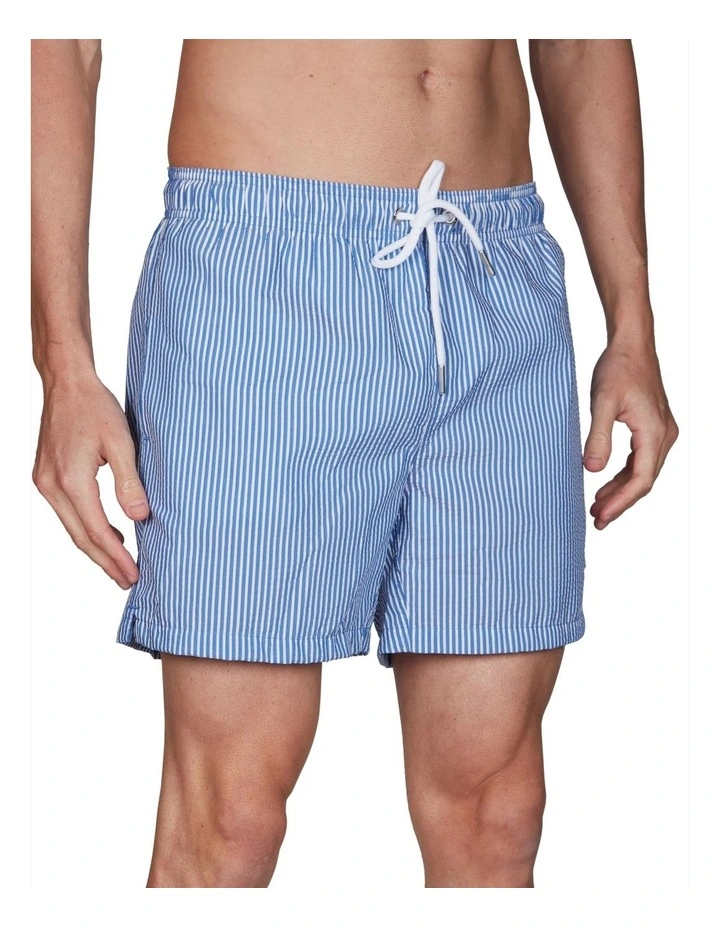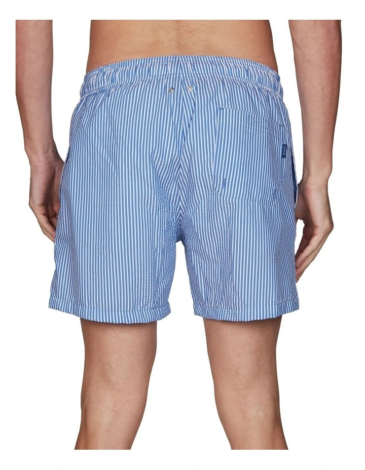 The Classic Fit Seersucker Swim Shorts sport a shorter length and feature an elastic waistband with a contrast-color drawstring and a back pocket with a velcro closure.. These easy-to-wear and classic swim shorts have a mesh inner pant and our signature GANT silicone badge at the left bottom leg.