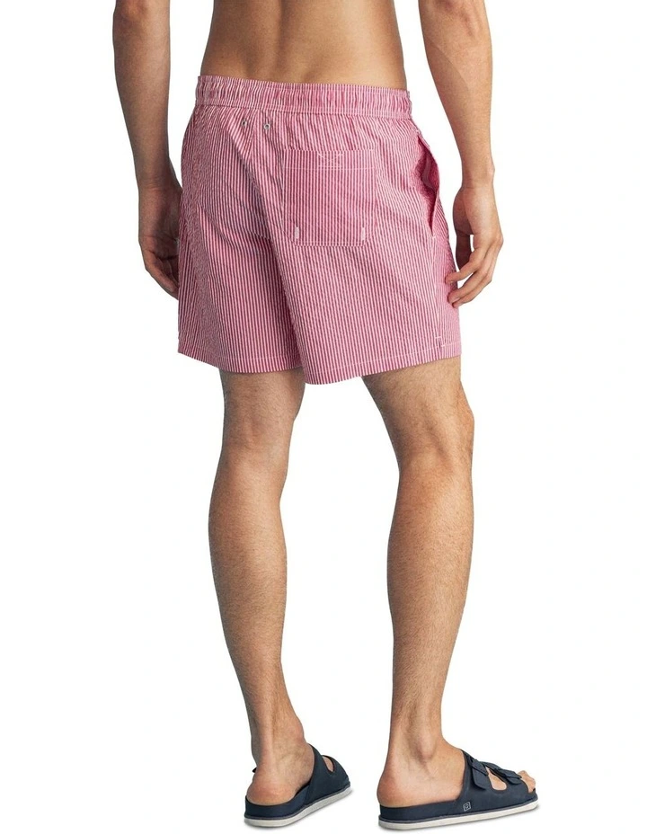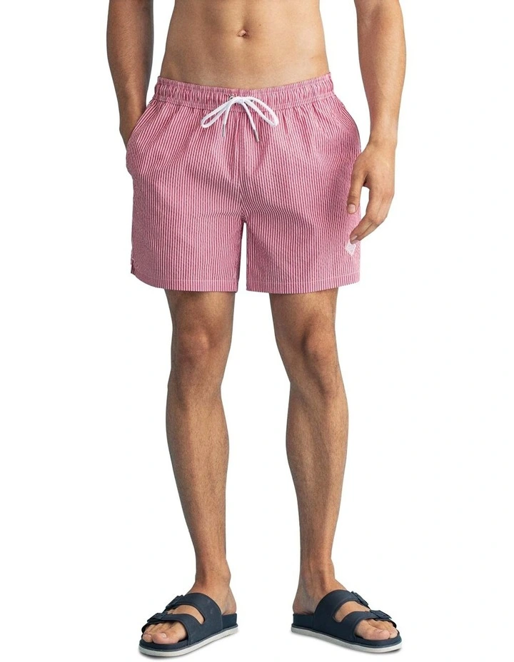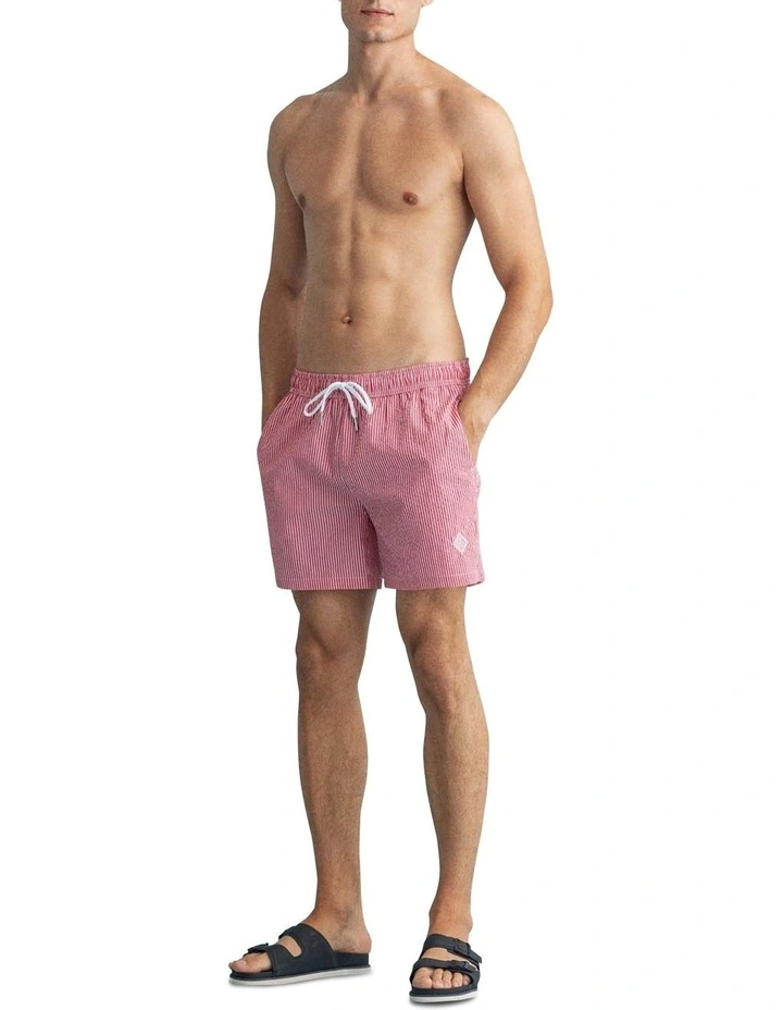 Crafted out of recycled polyester and cotton, the Classic Fit Seersucker Swim Shorts sport a shorter length and feature an elastic waistband with a contrast-colour drawstring and a back pocket with a velcro closure. These easy-to-wear and classic swim shorts have a mesh inner pant and our signature GANT silicone badge at the left bottom leg.