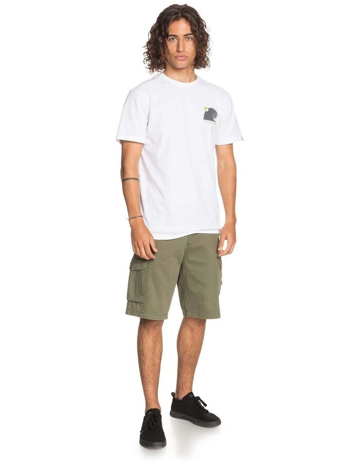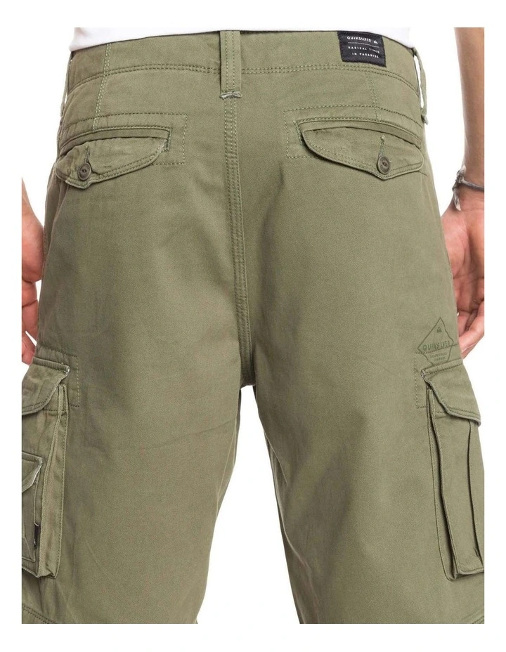 - Fabric: Peached cotton twill fabric [248 g/m2]Fit: Classic straight fit with tapered legsOutseam: 21″ outseam, long lengthWaist: Fixed waistband with zip and button closureFront side pocketDouble piped back pockets with flapSide cargo pocketsSmall pocket on left hand side pocketWash: Enzyme wash on fabricYarn-dyed stripes inside pocketsQuiksilver print on back leg